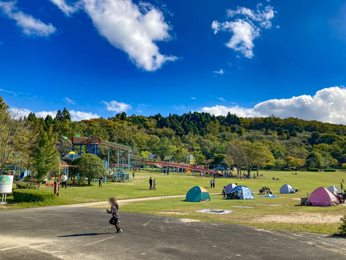 巨大なアスレチックで遊び倒した後、広大な芝生の上でピクニックも出来る、休日に最適な公園。