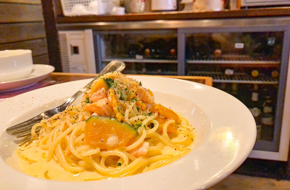 サーモンの歯応えと塩気、カボチャの甘味、濃厚なクリームソース。