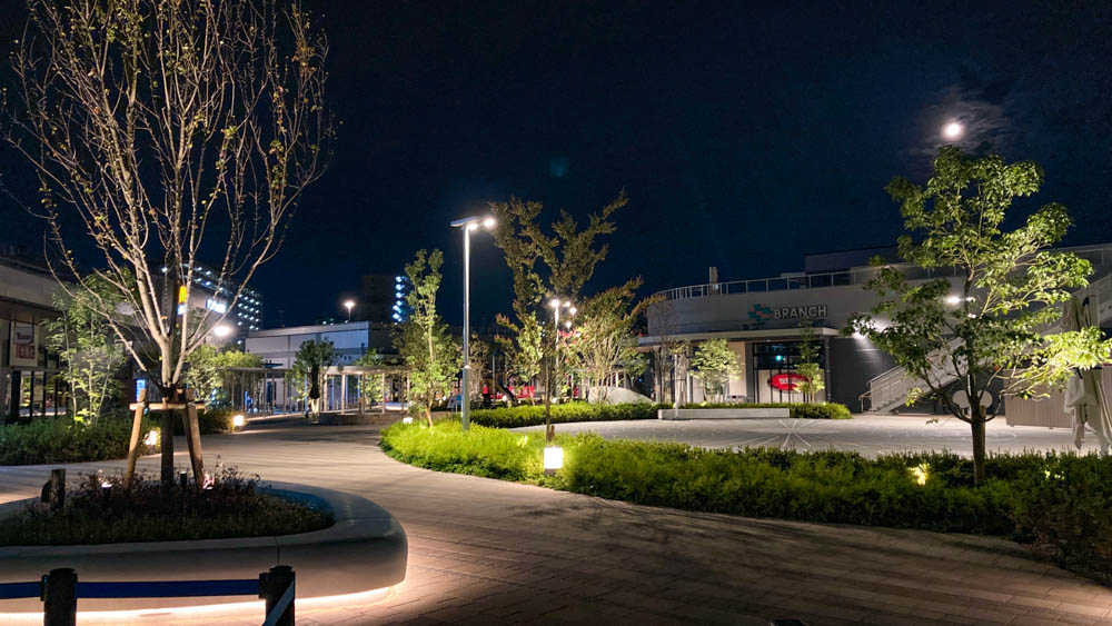 深夜なのでもちろんほぼ全てのお店が営業終了していましたが、敷地内のエレガントな雰囲気と、夜の静けさに癒される最高のロケーションとなっていました。