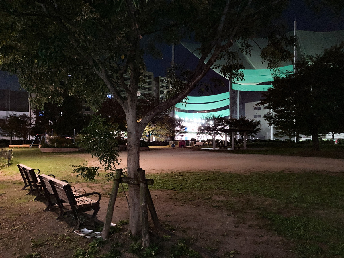 園内は街灯が灯っているので夜も明るいですが、脇に通っている歩道は真っ暗。