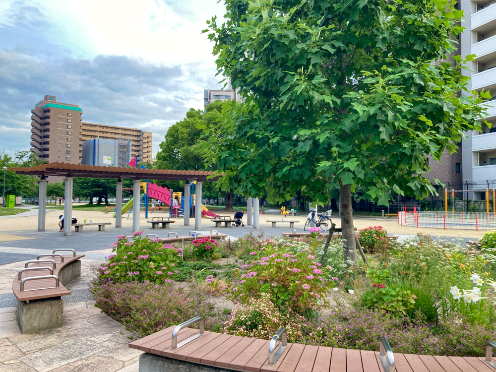 博多駅4丁目の住宅街、JR鹿児島本線沿いにある少し大きめの公園。