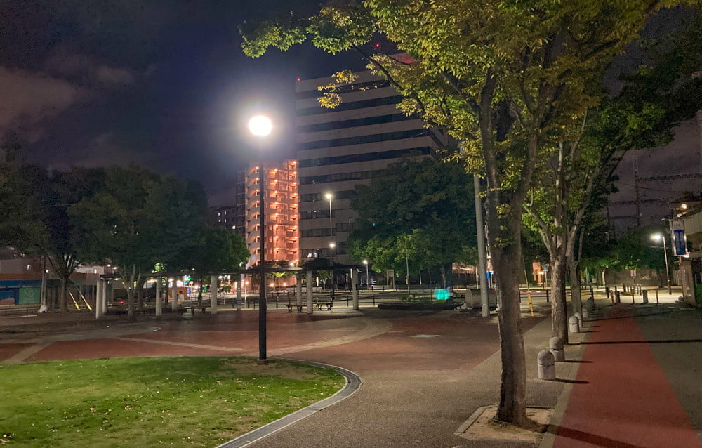 吉塚駅の真横にある、ベンチが点在するタイプの丁度良い公園「吉塚緑地」に行ってきました。深夜に。