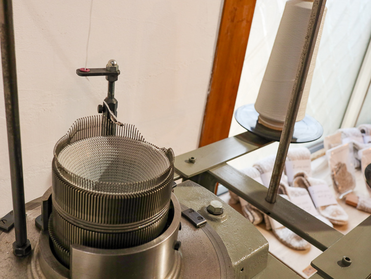 ・店内はさながら「博物館」。靴下製造機のレプリカや、靴下編み機のシリンダーなどを小物として飾り付けている。店内で細かい「パーツ」を探してみるのも面白い。