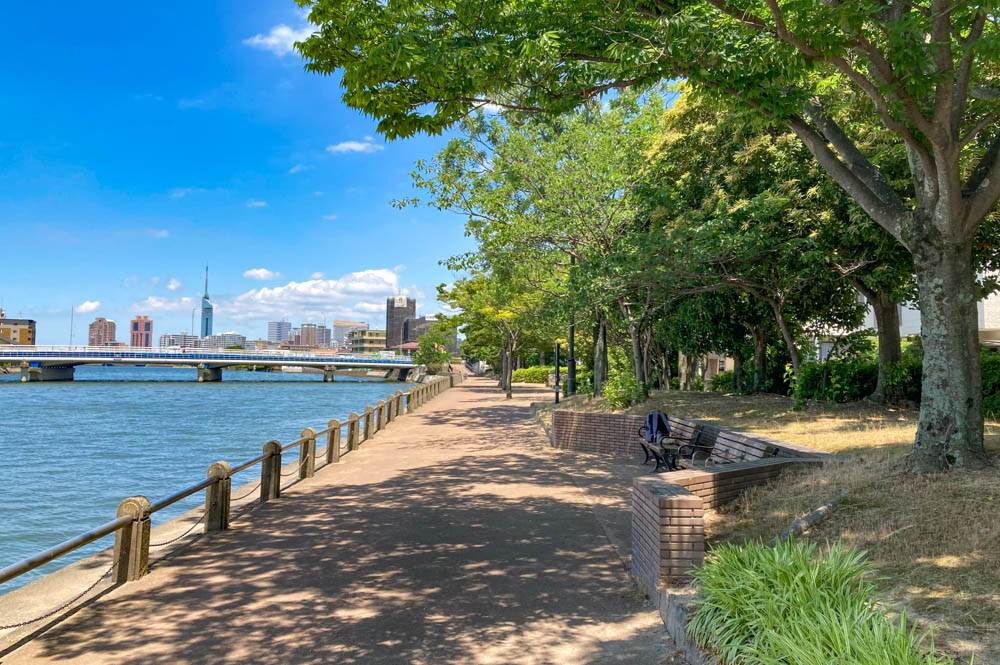 「室見川」に沿って遊歩道が設置されているロケーション。