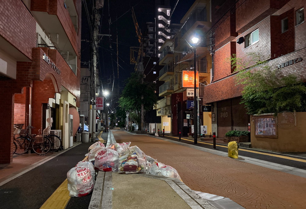 福岡市はゴミ収集が夜間に行われるので、上記写真にはゴミ袋が写っています。